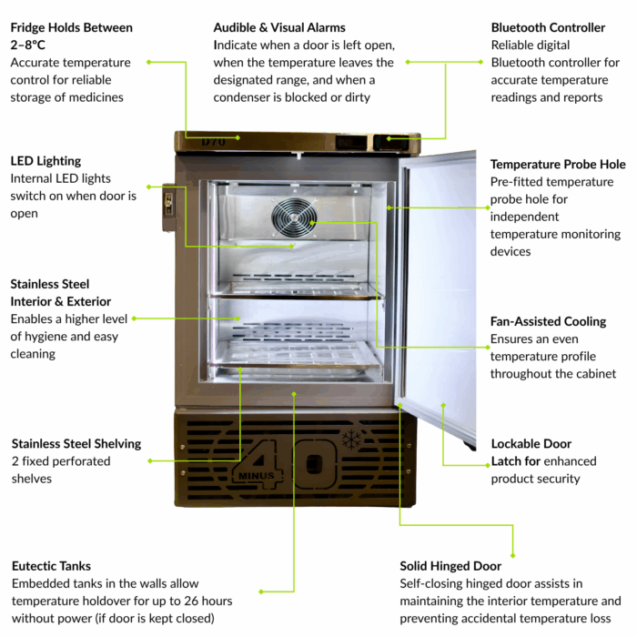 Minus40’s D70M Mobile Vaccine Fridge is a critical component in ensuring the integrity of the vaccine and medical cold chain, maintaining the required temperature of 2˚C to 8˚C during transit.